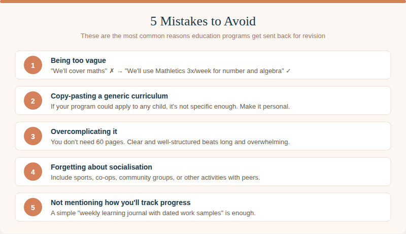 Writing your education program is the part of registration that causes the most stress for parents. You want to get it right, but you're not sure what the education authority is actually looking for.